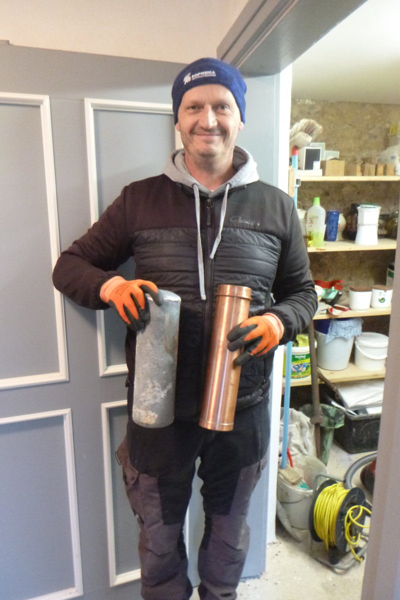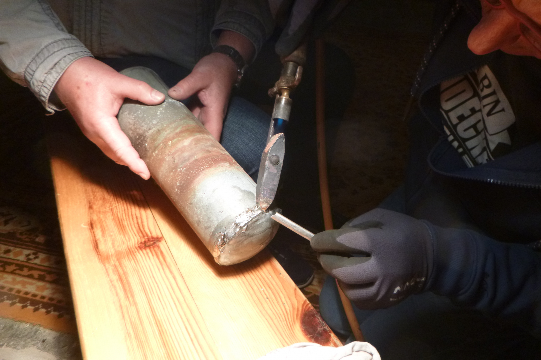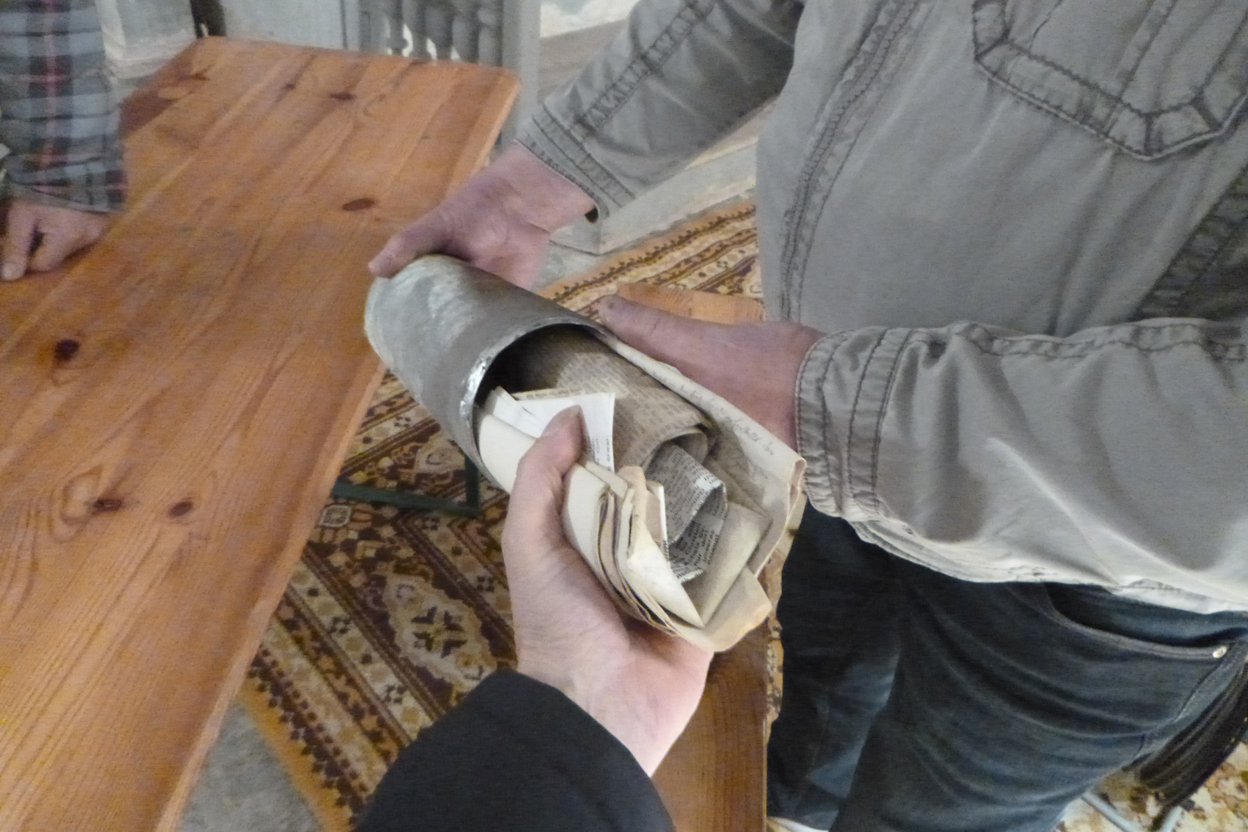 Die Zink-Kapsel von der letzten Eröffnung des Turmknopfes 1982 wurde im Kreise interessierter Anwohner geöffnet, gesichtet und wieder verschlossen. Eine neue Hülse mit aktuellen Zeitzeugnissen kam hinzu.