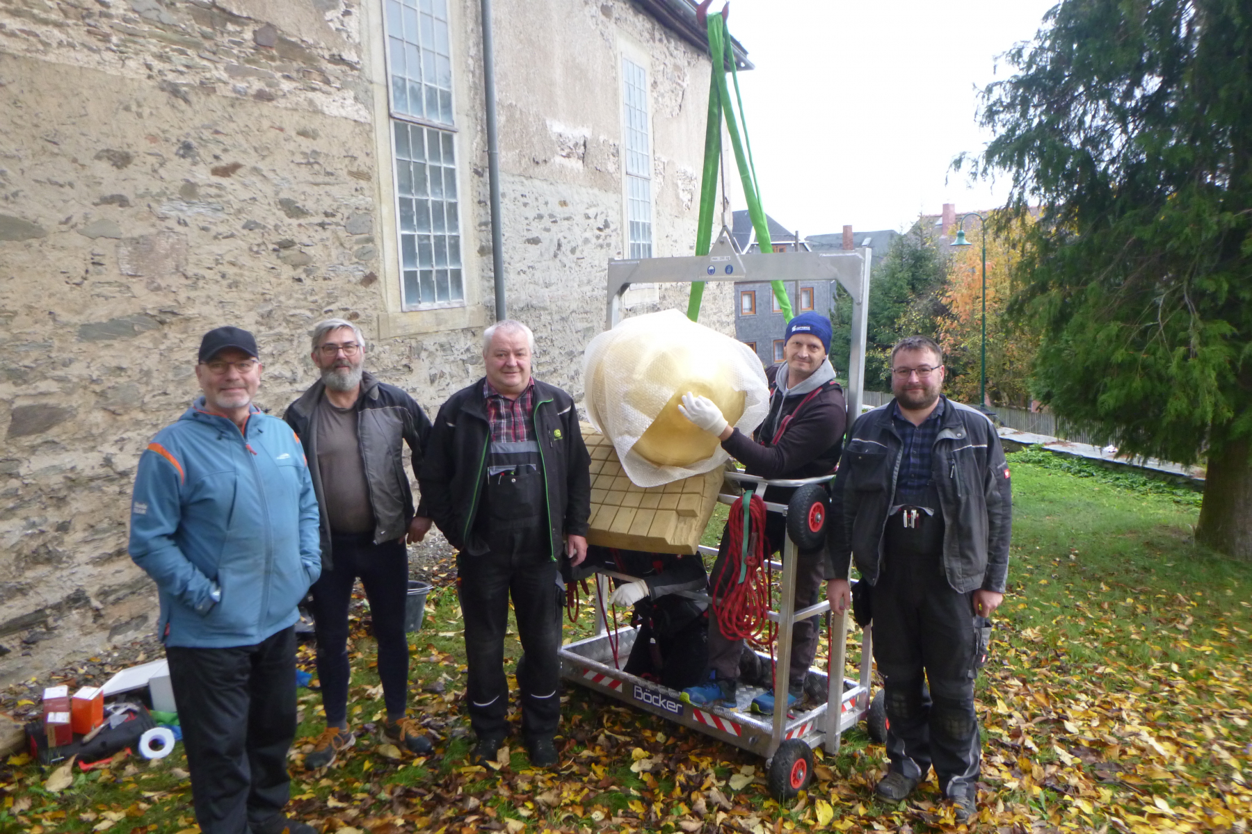 Um das Jubiläum feierlich begehen zu können, hat die Kirchgemeinde mit der Fa. Antignum, deren Chef Sebastian Garbers in Mellenbach zuhause ist, schon 2024 mit Arbeiten an der schief hängenden Kirchturmspitze begonnen. Zunächst wurden Turmknopf und Wetterfahne entfernt, sowie das schadhafte Holz vom sogenannten „Kaiserstiel“ zurückgeschnitten. Turmknopf und Wetterfahne wurden restauriert bzw. mussten teilweise erneuert werden.
