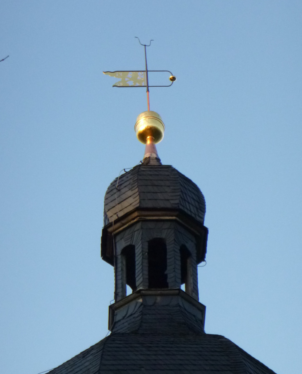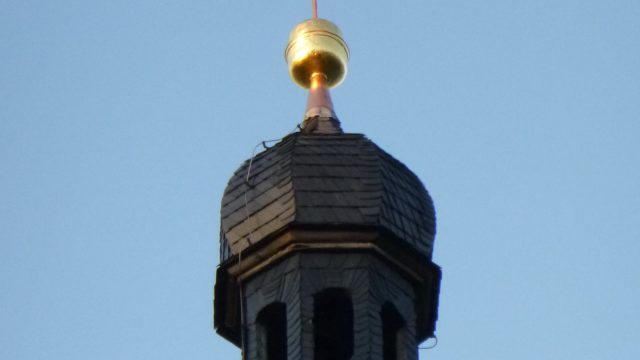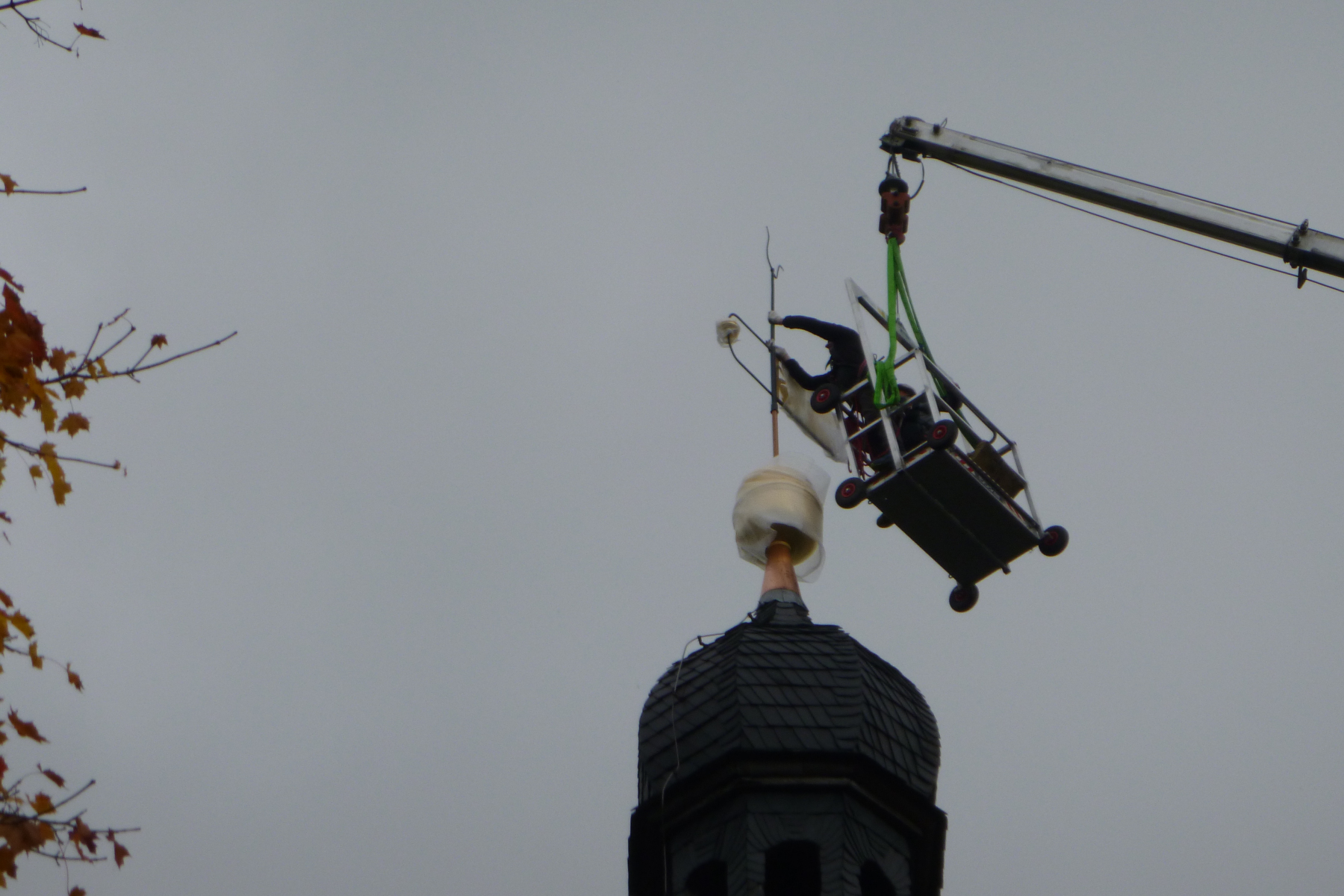 Doch es ging am Ende nochmal gut aus: Genau am Einweihungstag, dem 17.Oktober, gelang es, alles wieder mit einem großen Kran auf dem Kirchturm zu montieren. Etliche Einwohner verfolgten die schwierige Montage in dem freischwingenden Krankorb. Wo es möglich war, reparierte Sebastian Garbers mit seinem Lehrling Lukas auch gleich noch einige der kaputten Schiefer.