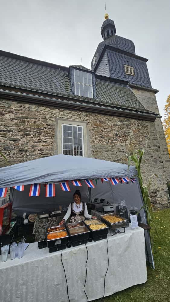 Mit einer reichhaltigen Auswahl asiatischer Spezialitäten (herzlichen Dank unserem Ortsteilbürgermeister Ingo Kürsten und seiner Frau!) sowie Thüringer Rostbratwürsten konnte jeder Gaumen über Mittag erfreut werden. Ein Mundartvortrag von Wilfried Heinze aus Schwarza folgte um 13 Uhr. Später gab es Kaffee und selbstgebackenen Kuchen. Für Kinder und Erwachsene gleichermaßen interessant war „Die Orgelmaus“ – vorgetragen von Annemarie Anders aus Rottenbach und Kantorin Anne-Sophie Bunk mit Klangbeispielen an unserer Schulze-Orgel.